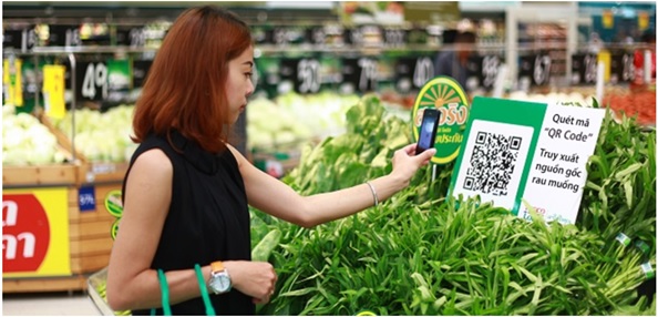 Figure. A customer uses her smartphone to check the information about food products