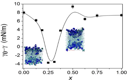 Figure. The Surface tension reduction of the mixed system of Terpinen-4-ol and 1,8-Cineole in tea tree oil across the skin lipid layer at different percentages of 1,8-Cineole in the mixture.